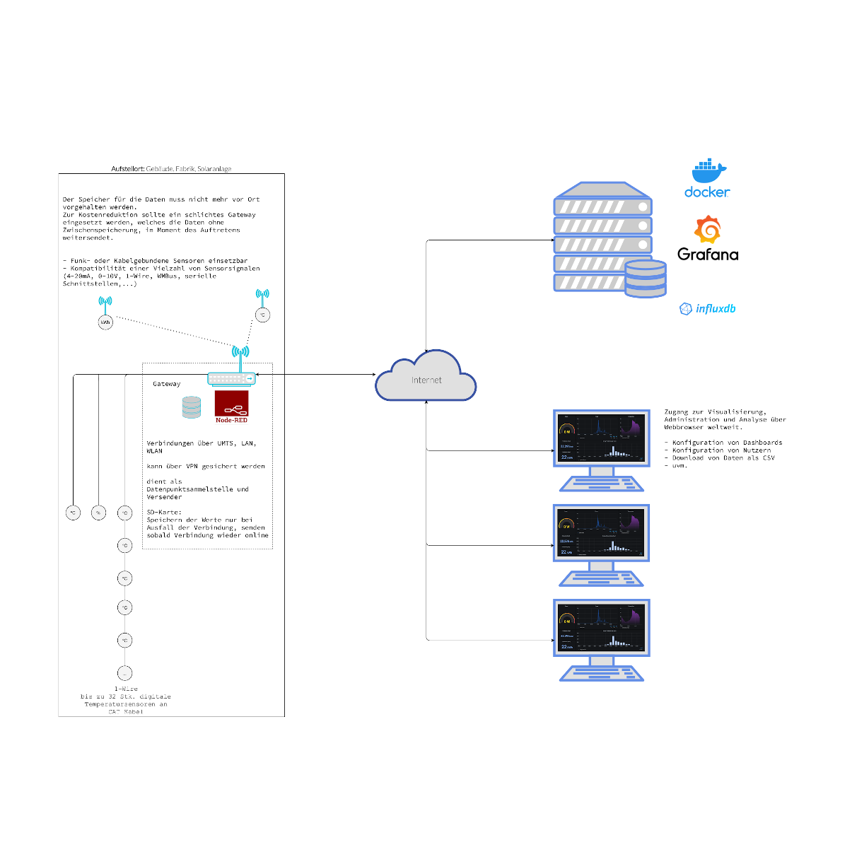 Die Datenerfassung geschieht durch Anbindung der Anlagensteuerung an ein IIoT-Netzwerk. Kontinuierlich werden Daten in Zeitreihendatenbanken erfasst und adhoc verfügbar gemacht. Auf individuell konfigurierbaren Dashboards werden Daten visualisiert und zur weiteren Analyse bereitgestellt. Individuelle Algorithmen greifen auf den Datenpool zu und verarbeiten relevante Werte zu Leitgrößen für die Prozessoptimierung.